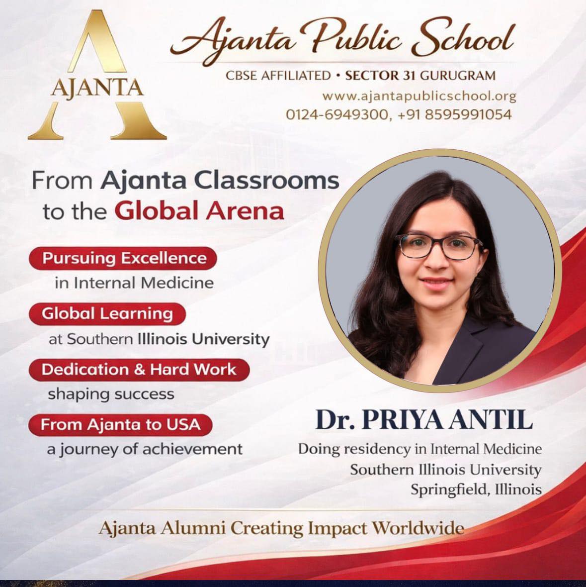 From the classrooms of Ajanta Public School to the global stage, we take immense pride in our alumna Dr. Priya Antil, who is pursuing her residency in Internal Medicine at Southern Illinois University, USA.