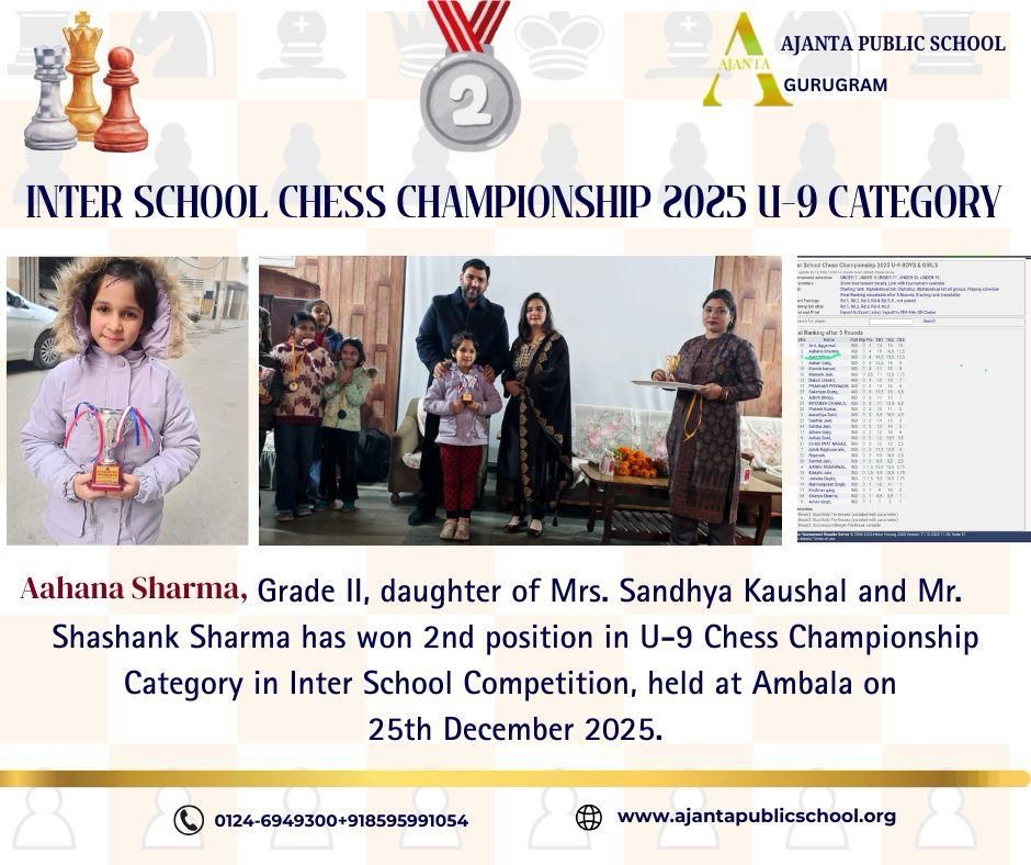 Ajanta Public School, Sector 31 Gurugram, proudly celebrates the outstanding achievement of its student Aahana Sharma, Grade II, who secured 2nd position in the Under-9 category at the Inter School Chess Championship 2025 held at Ambala.